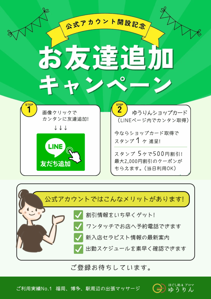 LINE公式アカウント 2026.01.202026.01.20未分類 HOME ブログ 未分類 LINE公式アカウント 投稿者: relaxation service Inc. 未分類 梅雨入り前に偏頭痛対策 関連記事一覧 夏バテの対策に! オイルマッサージで体と心をリフレッシュ! 2015.07.19未分類 イタ気持ちよくて最後はスッキリのすごい効果「タイ古式マッサー... 2015.09.04未分類 「待ちたくない」とお考えのお客さま 2015.07.22未分類 博多駅周辺のマッサージ店 2016.01.15未分類